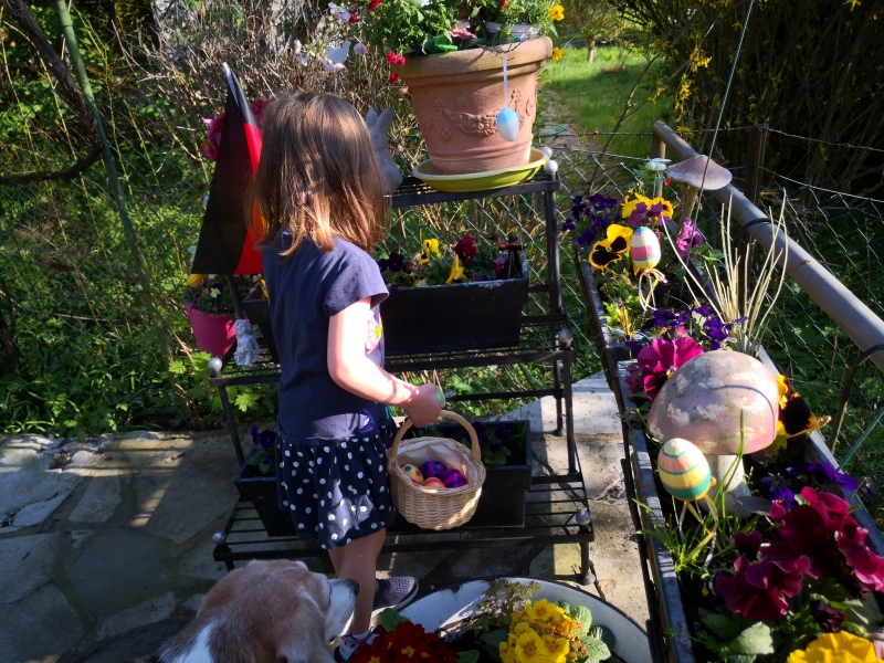Mein Freund Lucky guckt, ob Fabienne alle Eier für uns findet.