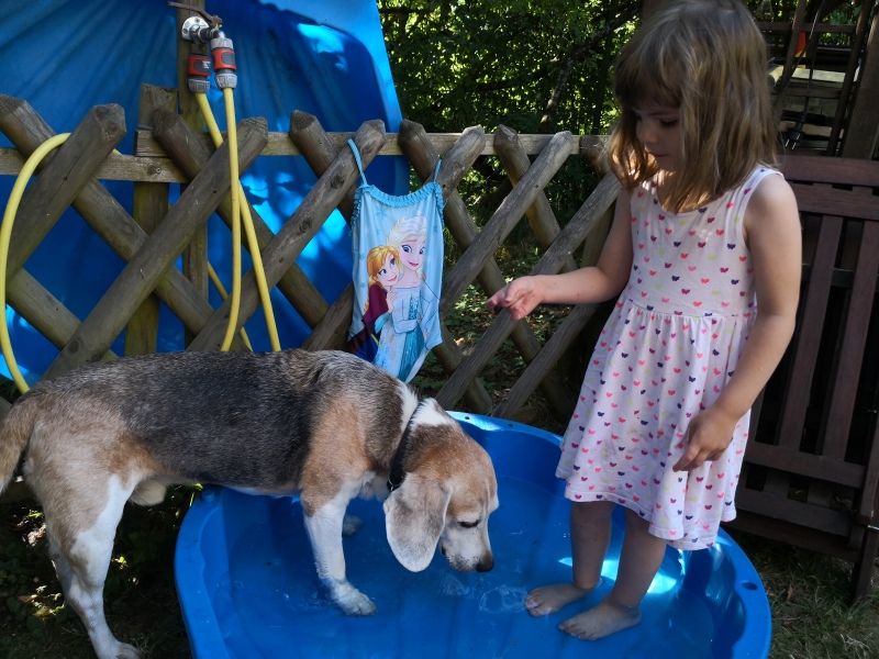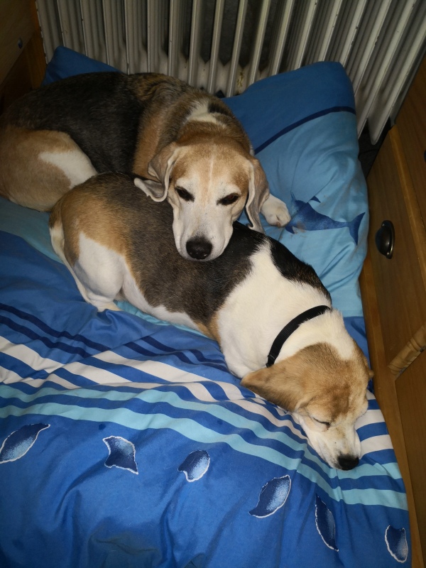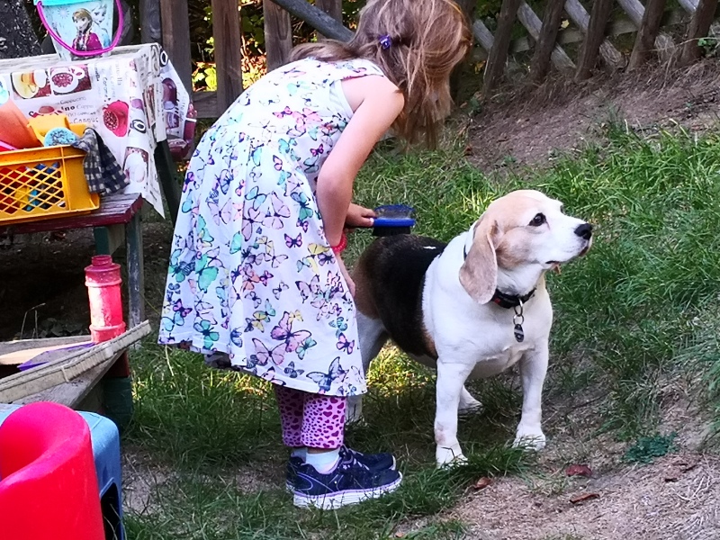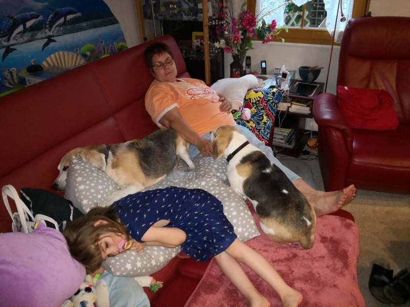Hier meldet sich mal wieder Zsoka die kleine Ungarin. Nach langer Zeit habe ich mal wieder Zeit gefunden einen kleinen Bericht zu schicken. Zsoka ist eine supersüße zuckersüße kleine Beagledame, die weiß was sie mag und nicht mag. Also fangen wir mal an mit Futter. Lucky bekommt so ein komisches Futter vom Tierarzt wegen der Gelenke, das hätte sie auch gerne mitessen können, aber „Nein“ Madame Zsoka hätte gerne ein anderes Trockenfutter, natürlich nicht zu hart und nicht zu weich, aber lecker solls sein. Geht klar, sie hat ja ihre Leute im Griff, also bekommt sie es. Sie ist ansonsten eine kleine Genießerin. Sie ist lieb, nur draußen an der Leine fühlt sie sich immer noch als größte. Hat aber inzwischen auch ein paar gefunden die sie mag. Sie hat es schon 3x geschafft Löcher unter dem Zaun zu buddeln heimlich, damit wir nicht wissen wo sie durch schlupft. Aber diese zweibeinigen Schlauberger kommen immer hinterher und machen doch glatt die mühevolle Arbeit wieder zu. Einmal stand Zsoka vor einen wieder zugemachten Loch und schaute es Minutenlang an, so nach dem Motto, das hat mir so viel Arbeit gekostet und jetzt. Also wir haben uns hier zu den anerkannten Löcherstopfern entwickelt. Die kleine hält uns immer auf Trab. Wenn ich sie rufe kommt sie aber immer gleich nach Hause und steht schwanzwedelnd vor der Türe meine kleine Nasenbestimmende Streunerin. Ich denke ich lasse ihr nächstes Mal die Türe auf. Zur Zeit hat sie sogar das spielen entdeckt. Letzte Woche als ich mit Lucky beim Wasserlaufband war hatte ich die Türe zum Wohnzimmer vergessen zu zu machen, da hat sie mal die Zeit genutzt und hat den Tisch inspiziert, natürlich wollte sie eigentlich aus dem Fenster gucken wo wir sind, aber da fand sie noch 3 trockene Brötchen, die lagen auf dem Boden, nicht lecker, aber die Packung Butterkekse von der Enkelin hat sie sich in ihr Körbchen geholt und die war natürlich lecker und bis auf den letzten Krümel leer. „Endlich mal was gutes“. Ich sagte dazu nur falls du Bauchweh usw. bekommst wissen wir wenigstens woher, aber die Dame lag völlig satt und zufrieden in ihrem Körbchen und es kam nichts außer ein voller Bauch. Die Dame zeigt Lucky wo es lang geht, sie hat das sagen und mein Schatz Lucky macht was sie will. Inzwischen lässt sie sich von mit auch mal einen Knochen wegnehmen und sieht es als Spiel. Lucky muss es noch immer heimlich klauen und dann kommt die kleine Zsoka als wolle sie es petzen und zappelt vor mir rum und wieder zum Lucky und wieder zu mir, da jeder einen hat. Geht auch teilen, nur Klein Zsoka verbuddelt ihren immer und dann wird mit dem anderen nicht gerne geteilt. Zsokas und Luckys Hobbys sind nach wie vor fressen, schlafen, schnüffeln, Eichhörnchen im Garten jagen, da hapert’s nur unten am Baum und das Eichhörnchen lacht sich eins ab oben. Man kann sich in die kleine süße einfach nur verlieben und Lucky meistert das alles so tapfer und ist wohl auch froh das sie da ist. Die beiden kuscheln auch gerne miteinander. Mit der Enkelin kuschelt Zsoka auch gerne, letztens musste ich mal lachen. Ich hatte mit der Enkelin geschimpft. Als ich sie suchte, saß sie bei Zsoka im Körbchen und erzählte Zsoka doch ganz im Vertrauen, das die Oma echt unmöglich wäre. Zsoka hörte ihr zu und musste nur aufpassen, da die kleine keine Stelle vergisst zu kraulen und zu streicheln, ich denke sie waren beide einer Meinung. Und Zsoka ist die beste Vertraute, die erzählt das nämlich nicht weiter. Sonst ist hier alles Prima. Ich lese immer kurz im Handy was alle so schreiben und kam nicht dazu selbst etwas zu schreiben. Wir haben den schönen Sommer prima überstanden. Lucky hat sehr gute Blutwerte, nur die Hinterbeine wollen nicht mehr so wie er es will, aber bloß keine Schwäche zeigen vor der Dame. Zsoka bekommt dann im Oktober wieder alles untersucht und auch noch mal wegen der Herzwürmer noch ein Nachtest. Gestern musste ich auch einmal lachen, dieser Blick von Zsoka, wenn Lucky zuerst etwas zu essen bekommt, diese Panik , das sie nur nicht vergessen geht, glaube diesen Blick kennt jeder Beaglebesitzer. Die Beagles sind einfach so tolle Hunde mit ihren eigenen Persönlichkeiten. Jetzt nochmal eine kleine Auswahl an Bildern der letzten Monate.