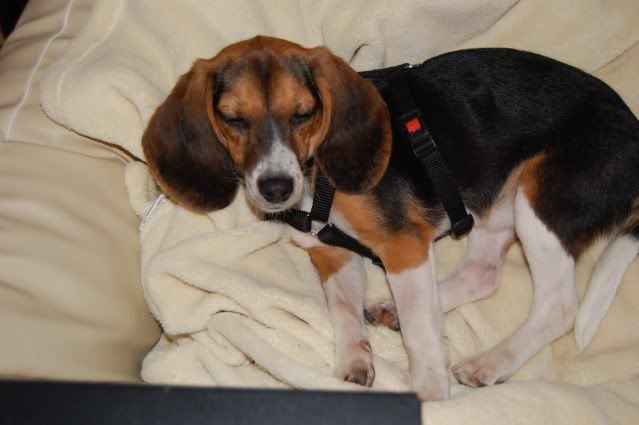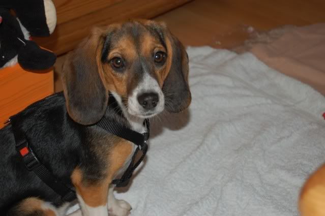 Die erste Nacht war ruhig und jetzt amüsiert sie sich gerade mit einem Kauknochen im wechsel mit Stofftieren, die tot geschüttelt werden.