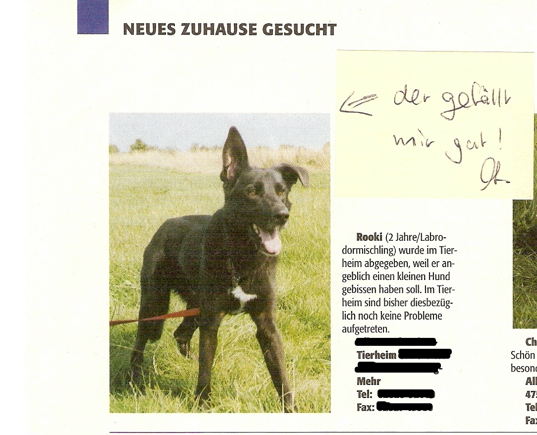 Eines schönen Tages legte mir eine Kollegin eine Tierschutzzeitung auf den Tisch. Sie wusste, dass ich suche, hatte auch selbst bereits einen eigenen Hund. Wartet, ich habe sie noch, nein nicht die Kollegin, die auch, aber ich meine die Zeitung. :huh: Mensch und Tier aus 2001. Es gab hinten eine Rubrik „Neues Zuhause gesucht“. Und daaa auf Seite 92 lachte er mich an, Rookie, ein Schäferhundartiger, schwarz mit weißem Fleck auf der Brust, ein Stehohr und ein „Knickeohr“. Ein kleines post-it habe ich für meine Kollegin drauf gemacht, was da heute noch klebt. Was erzähl ich, ich muss es Euch schnell einscannen. Denn die Zeitung samt post-it hat sie mir später als Andenken wieder gegeben.