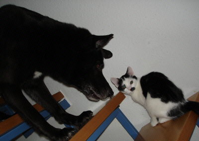 Nächster Versuch, Katze fixiert, Rookie fixiert, Batsch! Egal, ich werd's schon rausfinden, wie sie mich akzeptiert, muss er gedacht haben. Katze brummt, Rookie brummt, Batsch! Ich sag Euch, es ging wirklich über eine ganze Zeit. Immer imitierte er das Katzenverhalten, was aber immer schon nichts Gutes bedeutete – und genau das las sie natürlich auch in seiner Kopie – nichts Gutes. Also blieb immer nur wieder Batsch, eins auf die Nase. Herrlich, mein armer Tropf. Er hat's nie krumm genommen – und hat dann doch meist eher aus der Ferne weiter gehütet und die Katzenklappe auf Kommen und Gehen überwacht.