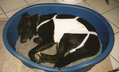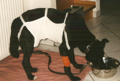 Die ersten Tage nach der OP waren besonders schwer. Ich weiß nicht, ob man beim Tierarzt bewusst etwas dramatisiert hatte. Jedenfalls hatte man uns angewiesen, ihn möglichst überhaupt nicht zu bewegen, ihn am besten an kurzer Leine irgendwo festzubinden. Er schwebe noch ein paar Tage in Lebensgefahr. Und wenn er ein paar Schritte würde gehen müssen, um sich kurz zu lösen, dann nur im Zeitlupentempo an kurzer Leine und sofort wieder zurück auf's Krankenbett. Und daran haben wir uns auch strikt gehalten.