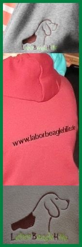 Die Artikel werden auf der Vorderseite mit dem LBH-Logo bestickt (nicht gedruckt!) und auf der Rückseite mit dem Schriftzug der Homepage (www.laborbeaglehilfe.de).